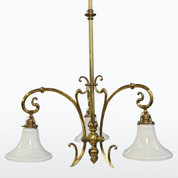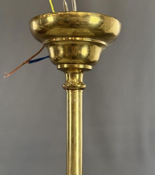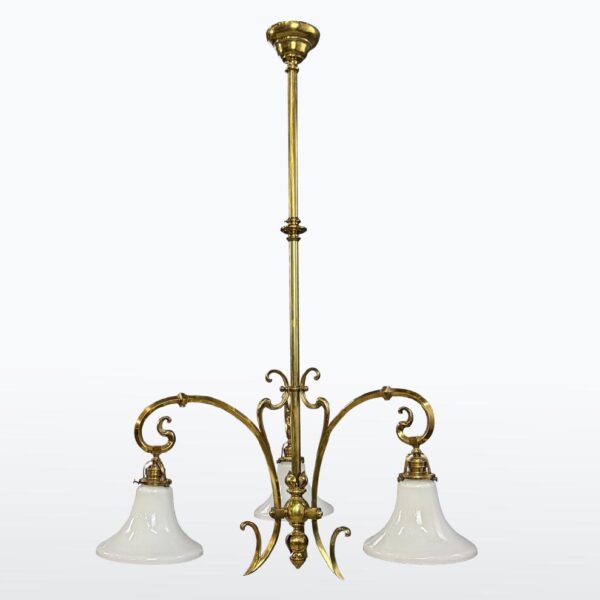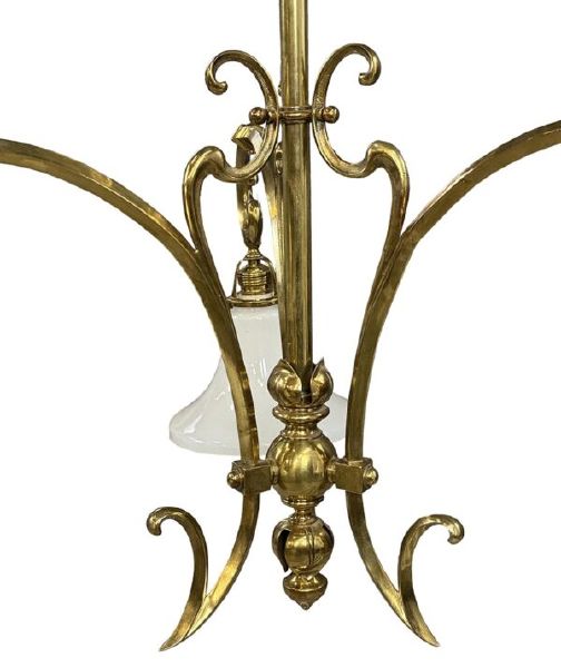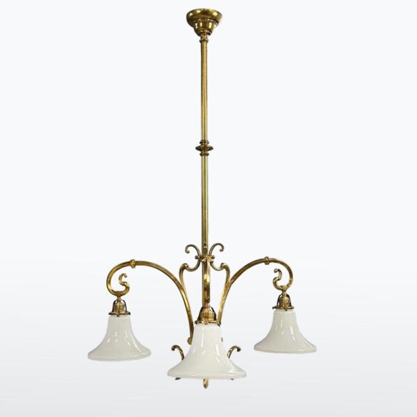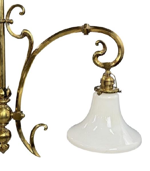 mosaz, sklo, stínidla původní, mléčně bílá, restaurováno, nová elektroinstalace, původ pravděpodobně Čechy nebo Rakousko