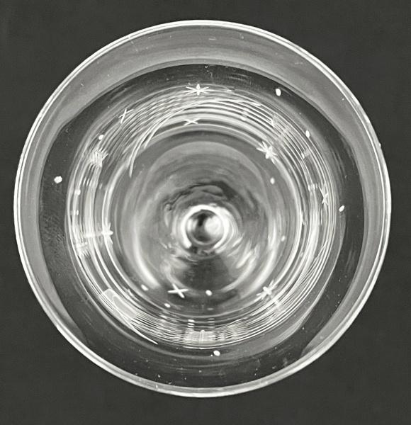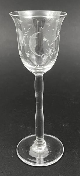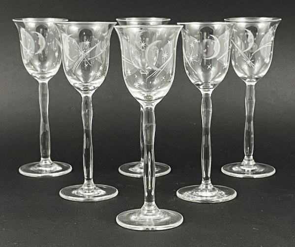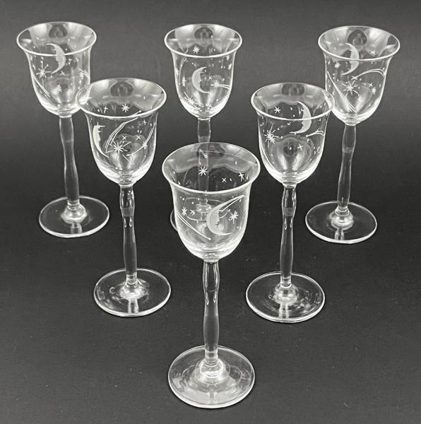 Bezbarvé ručně broušené tenkostěnné sklo. Období a styl: art deco a prvky vídeňské secese. Haida (Nový Bor) nebo Steinschönau (Kamenický Šenov) nebo Alois Metelák (1897-1980) spolu se studenty tehdejší Státní odborné sklářské školy v Železném Brodě. Ovlivněno tvorbou slavného vídeňského architekta a designéra Josefa Hoffmanna (1870-1956). Zvláště jeho návrhy mušelínového nápojového skla pro firmy J. & L. Lobmeyr, které byly často vyráběny v Čechách. Sada šesti skleniček na likér s kupou ve tvaru kalichu zdobená ručně broušenými hvězdičkami a kometami. Stylová profilovaná vysoká nožka zakončená kulatou patkou. Ve výborném stavu. Čechy 1925 - 1935. Výška 13 cm.