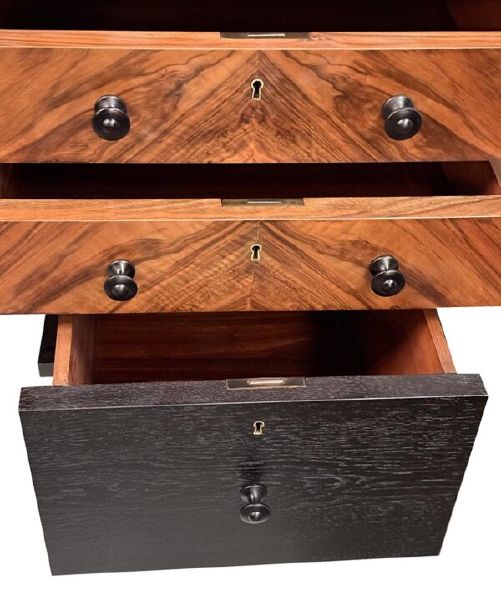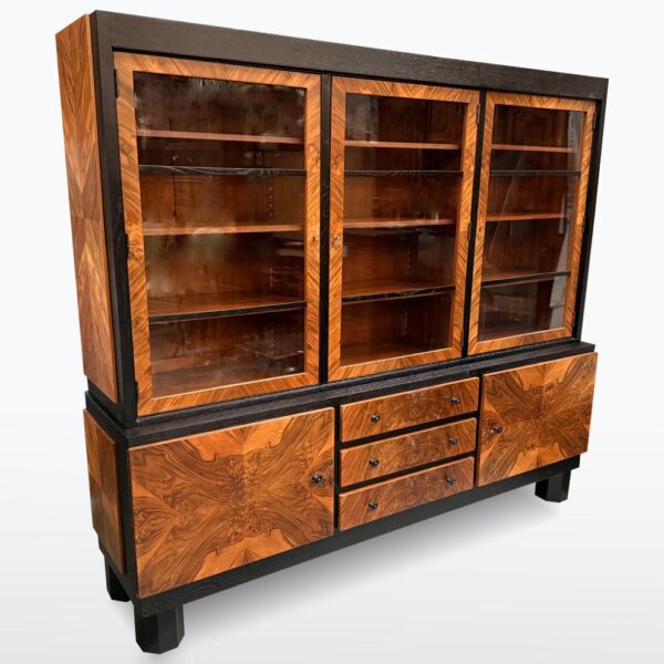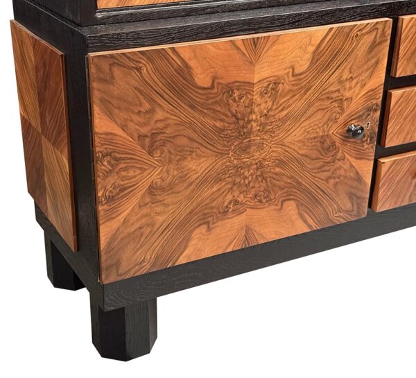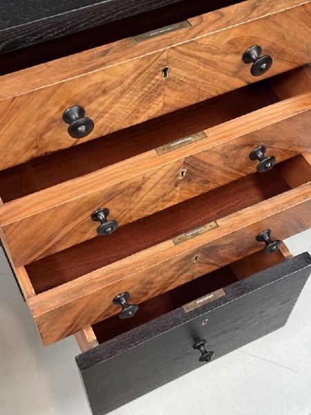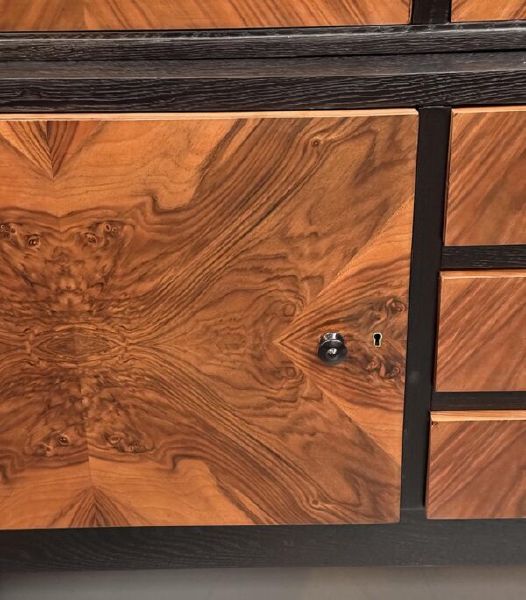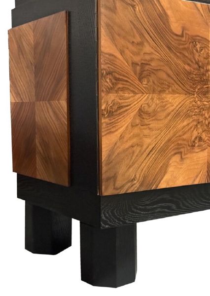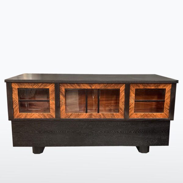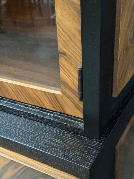Materiál: ořechová dýha, černě mořené dubové dřevo, sklo,