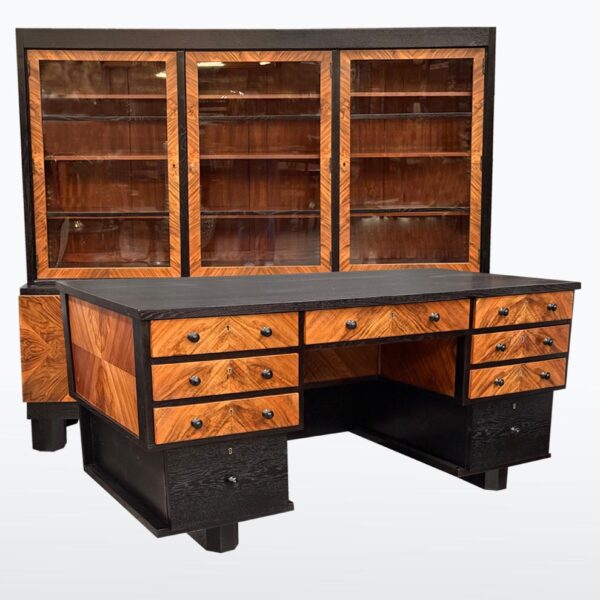 stůl má mimořádně praktické uspořádání s množstvím zásuvek, jeho součástí je malá prosklená knihovnička.