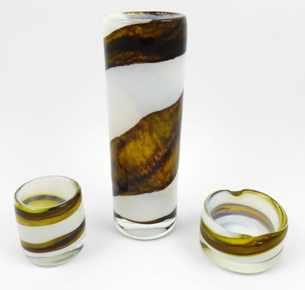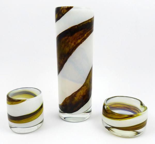 Křišťálové, bílé a barevné silnostěnné sklo. Autor designu: Bengt Orup (1916-1996) pro sklárnu Johansfors Glasbruk. Designová sada vázy, misky a popelníku kulovitého tvaru z mléčného silnostěnného skla s barevnými melírovanými pásy připomínajícími přírodní sedimenty přejímané vrstvenou bezbarvou sklovinou. Švédsko 1967 - 1973. Výška vázy 28 cm, výška misky 9 cm a výška popelníku 7 cm.