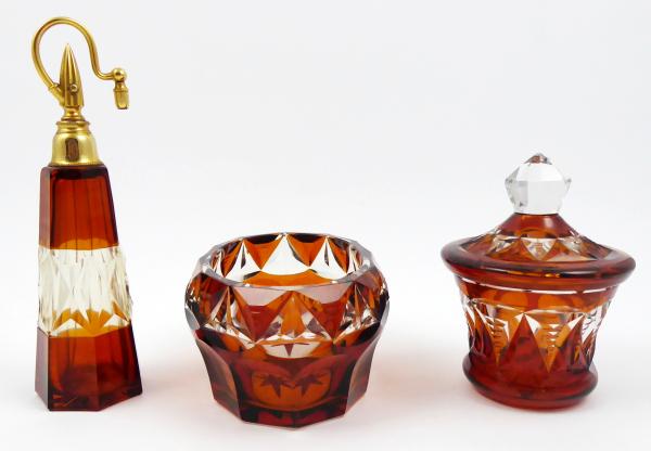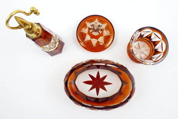 Bezbarvé ručně broušené sklo přejímané ambrovou lazurou, mosazná montáž. Období a styl: art deco. Toaletní souprava složená z flakonu na parfém s mosaznou montáží, dózy se zdobným víkem a odkládací oválné misky z ručně do fazet a dekorativních reliéfů broušeného skla přejímaného ambrovou lazurou. Na dnu všech tří nádob ručně broušené hvězdice. Místy velmi drobné oťuky. Československo 1925 - 1935. Výška flakonu na parfém či toaletní vodu 21 cm, výška dózy 14,5 cm, průměr dózy 10 cm, výška misky 8,5 cm, šířka 15 cm, hloubka 12,5 cm.