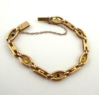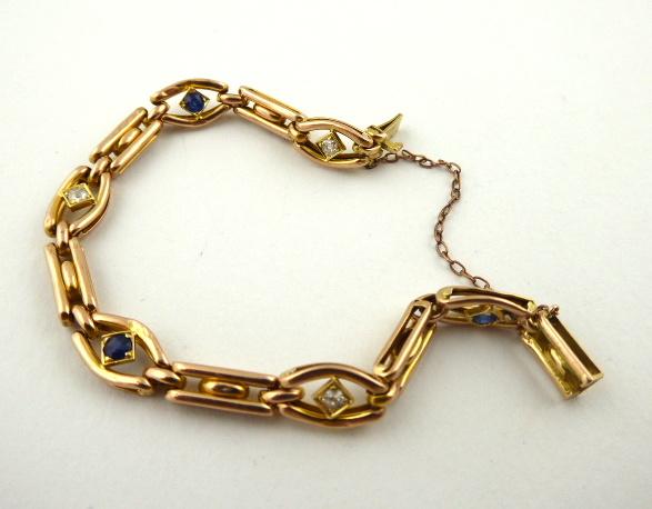 Čtrnáctikarátové zlato, přírodní safíry a přírodní diamanty. Ryzost Au 585/1000, celková hmotnost 8,40 g. Velmi působivý zlatý článkový náramek na drobnější dámské zápěstí se třemi přírodními diamanty starého briliantového brusu o celkové váze 0,25 ct, barva G, čistota P doplněnými o tři články s třemi přírodními ručně broušenými safíry modře syté barevnosti. Náramek je ve výborném stavu a má bezpečnostní pojistku na zavírání. Nově označeno platným českým puncem labuť. Evropa 1900 - 1920. Délka 90 mm.