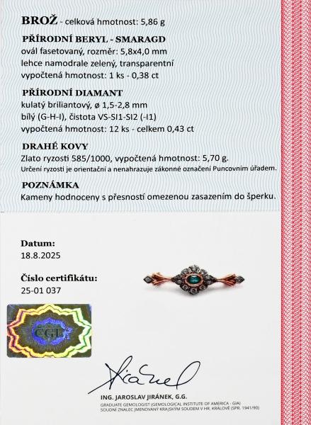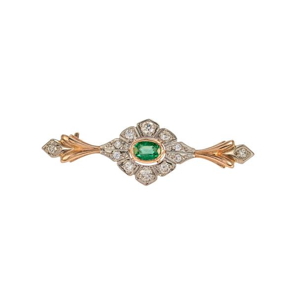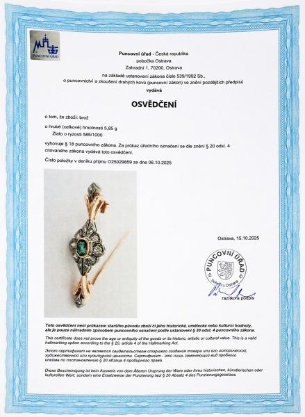 Starožitnost: Zlatá brož s diamanty 0,43 ct a smaragdem 0,38 ct