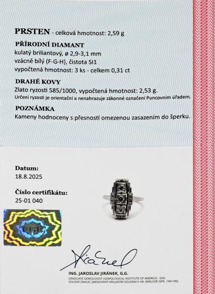 Bílé o ryzosti 585/1000 | váha 2,60 g | velikost 51 | míry hlavy 1,8 x 1 cm | přírodní diamant 3 ks 0,31 ct, vzácně bílý (F-G-H), čistota SI1, průměr 2,9-3,1mm | výborný stav | osvědčení puncovního úřadu | certifikát z gemologické laboratoře je součástí šperku