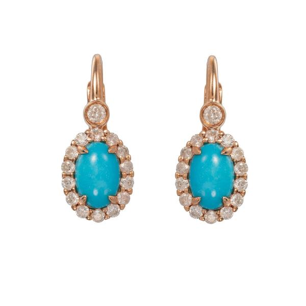 Žluté zlato o ryzosti 585/1000 | váha 1,95 g | výška s ouškem 1,5 cm | výška hlavy 0,8 x 0,6 cm | diamanty 0,29 ct | tyrkys 2ks 0,77 ct | nová práce | výborný stav | puncováno platným puncem | kameny s garancí pravosti zkontrolované v gemologické laboratoři