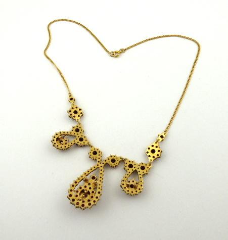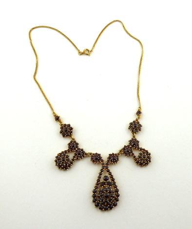 Zlacené stříbro, přírodní české granáty. Ryzost Ag 900/1000, celková hmotnost 16,20 g. Družstvo umělecké výroby Granát, Turnov. Elegantní náhrdelník ze zlaceného stříbra s centrální velkou kapkou lemovanou květinovými tvary s ručně broušenými i reliéfně vrstvenými přírodními českými granáty. Značeno: československý punc zajác, značka výrobce G2. Československo, Turnov, od roku 1957. Délka náhrdelníku včetně závěsu 470 mm, výška závěsu 80 mm.