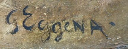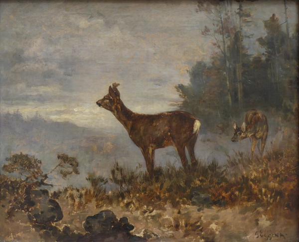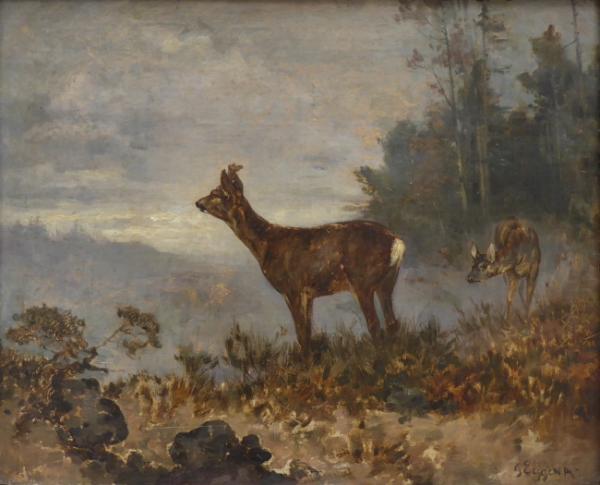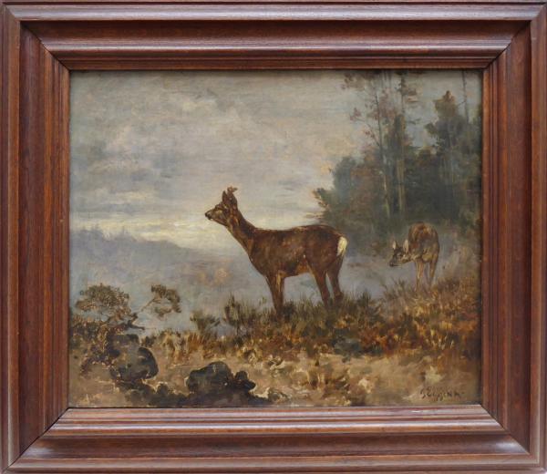 Olej na plátně 36 cm x 44 cm. Autor: Gustav Eggena (1850-1915) německý malíř krajin a žánrových scén. Signováno vpravo dole. Srnčí pár na mýtině zobrazený za soumraku. Mistrovsky zachycená anatomie zvěře na této lehké vzdušné malbě s osobitým rukopisem malíře. V profilovaném rámu z dubového masivu mořeného na světle hnědou. Německo 1880 - 1915. Celkový rozměr s rámem 52 cm x 59 cm.
