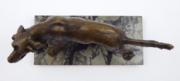 Patinovaný bronz, mramor. Nesignováno. Socha slídícího ohaře z patinovaného bronzu na mramorovém podstavci. Čechy 1900 - 1940. Výška 14 cm, šířka 29 cm. Rozměr podstavce 11 cm x 26 cm.