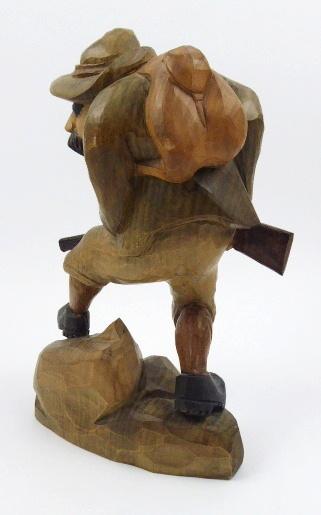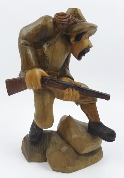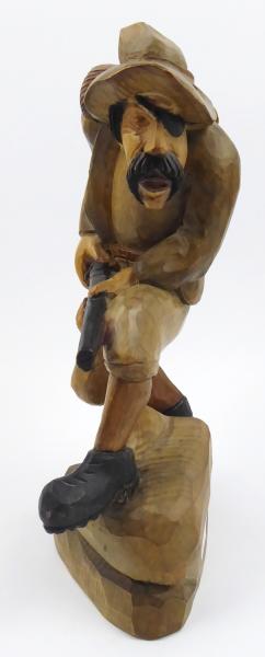 Barevně kolorovaná a mořená ruční dřevořezba. Dřevořezba jednookého pytláka v klobouku a pytlem na kořist na zádech plížícího se lesem s puškou v ruce. Žertovně ztvárněná figura. U lýtka pravé nohy lepená část. Střední Evropa 1890 - 1940. Výška 30 cm.