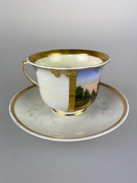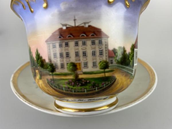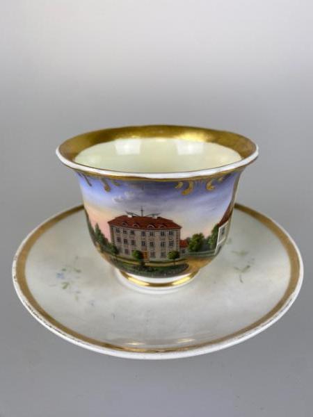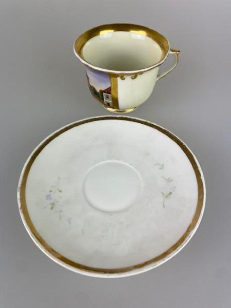 Šálek s podšálkem zdobený miniaturou značený viz foto, šálek 9*7*10,5 a podšálek 14,5cm