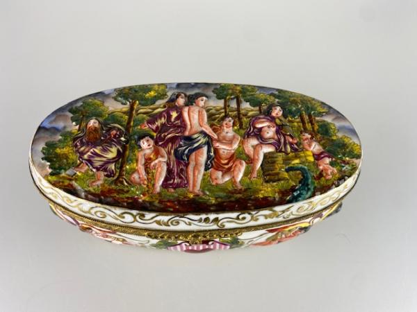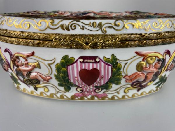 Porcelánová krabička s víkem bohatě zdobená reliéfními motivy, značená viz foto 19*8*10cm
