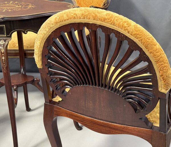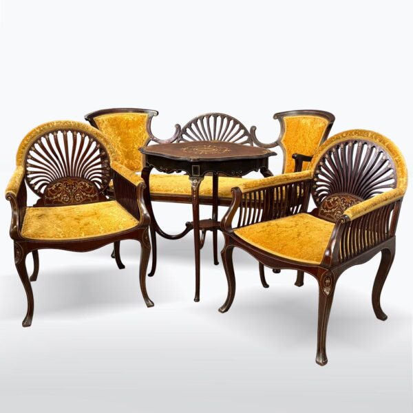 Skládá se ze dvou křesel, dvoumístné pohovky a stolku. Křesla i pohovka mají opěradla s jemně vyřezávanými prvky, které připomínají rozvíjející se vějíř. Zlatavé čalounění s bohatým vzorem dokonale doplňuje tmavý mahagon a dodává soupravě honosný vzhled.