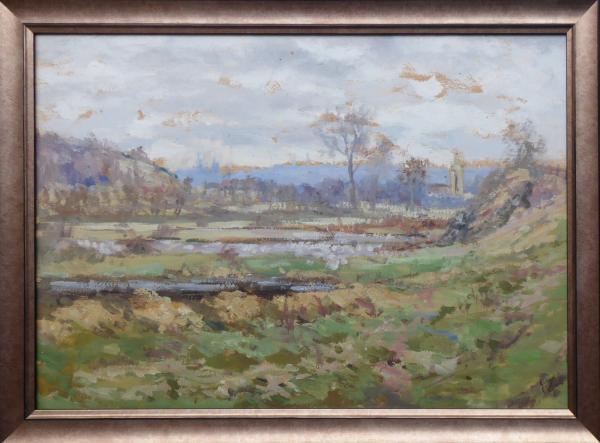 Olej na kartonu 29 cm x 42 cm. Vzadu originální štítek se jménem autora a názvem obrazu. A štítek rámařství, které obraz nově zarámovalo. Autor: Jindřich Stehlík (1905-1991). Motiv ticha uprostřed zeleně přírody za Prahou. Na horizontu věže připomínající blízkost rušného velkoměsta. Nově zarámováno v úzkém rámu s patinou měděné barevnosti. Československo 1950 - 1970. Celkový rozměr s rámem 33,5 cm x 46,5 cm.