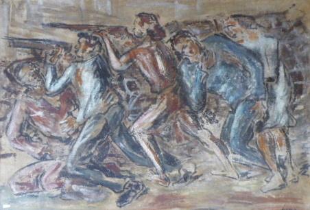 Olej na kartonu 49 cm x 71 cm. Signováno vpravo dole. Aloys Wach? (1892-1940). Bitevní řež v ulicích města na jedné z barikád. Ve zlaceném profilovaném rámu se sklem. Rakousko 1930 - 1940. Celkový rozměr s rámem 61 cm x 83 cm.