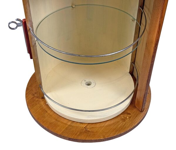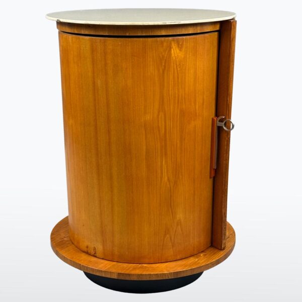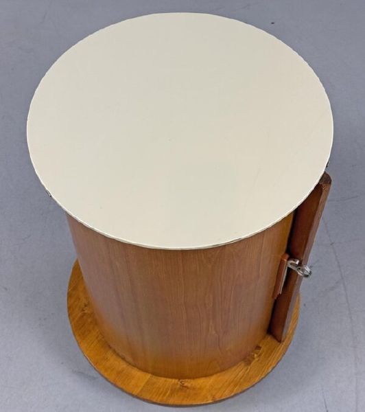 Materiál: Válcové tělo je zhotoveno z bukového dýhovaného dřeva. Stolek stojí na masivní kulaté základně, která zajišťuje stabilitu, sklo a původní opaxit,