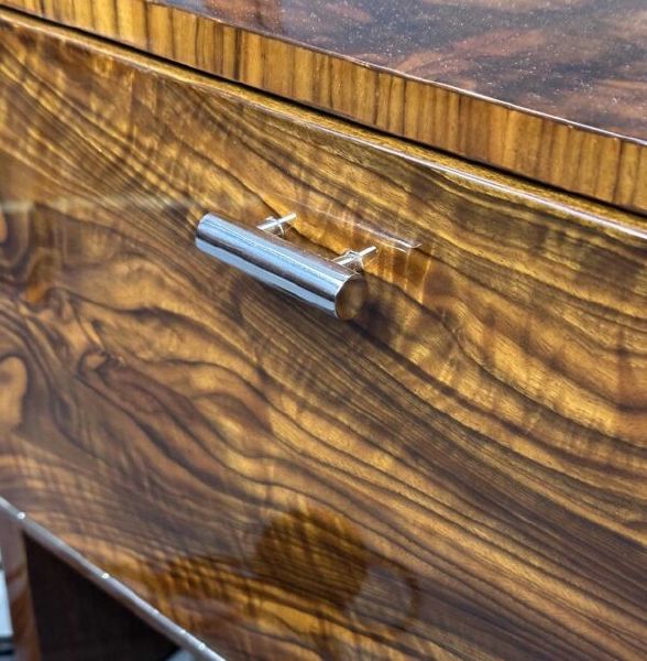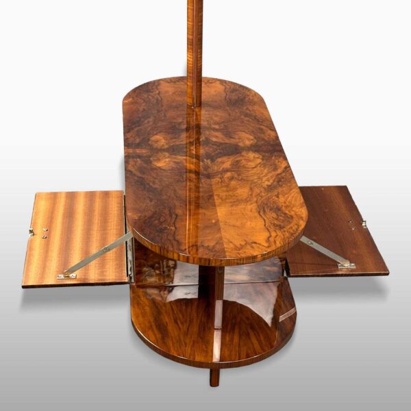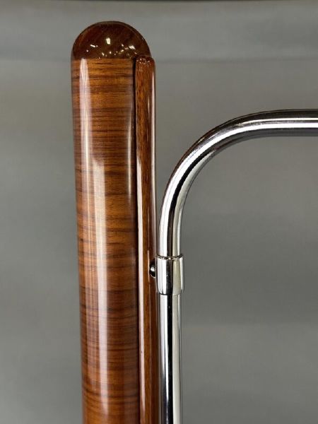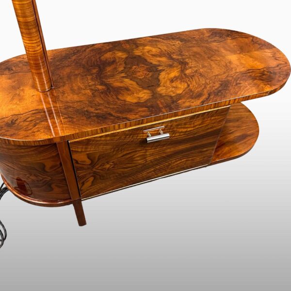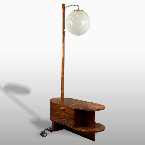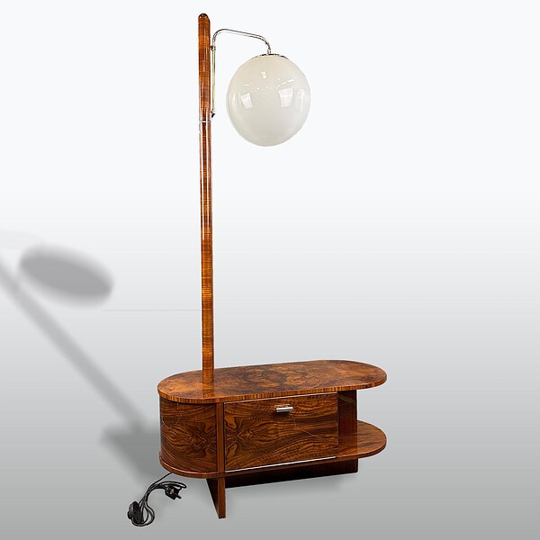 materiál: bukový masiv, ořechová kořenice, mahagonová dýha, chromovaná trubka, opálové stínidlo, odborně restaurováno polyuretanovým lakem, leštěno do vysokého lesku. Nová elektroinstalace.