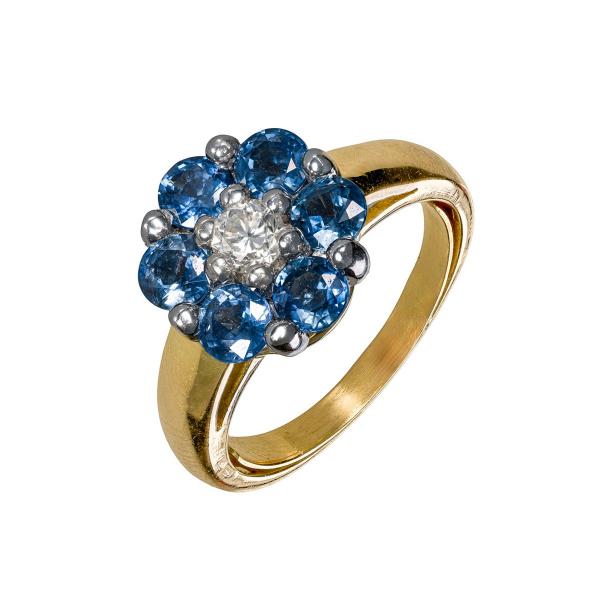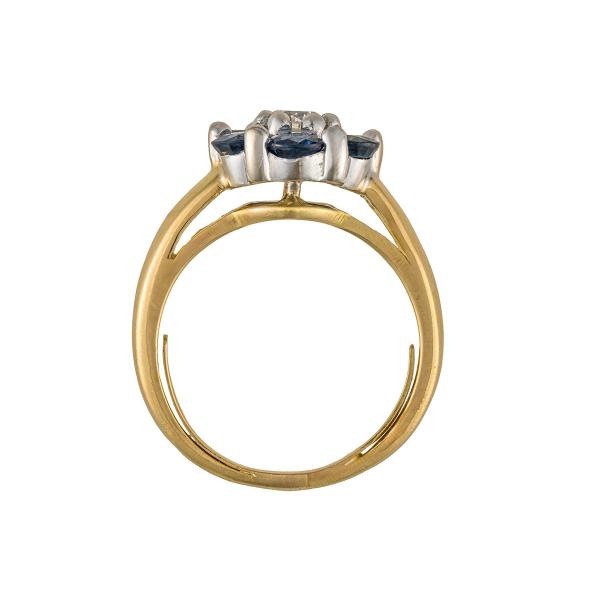 Starožitnost: Zlatý prsten s přírodním diamantem a safíry