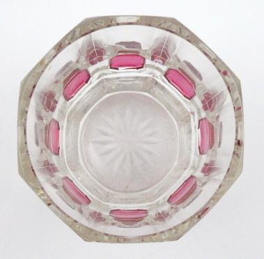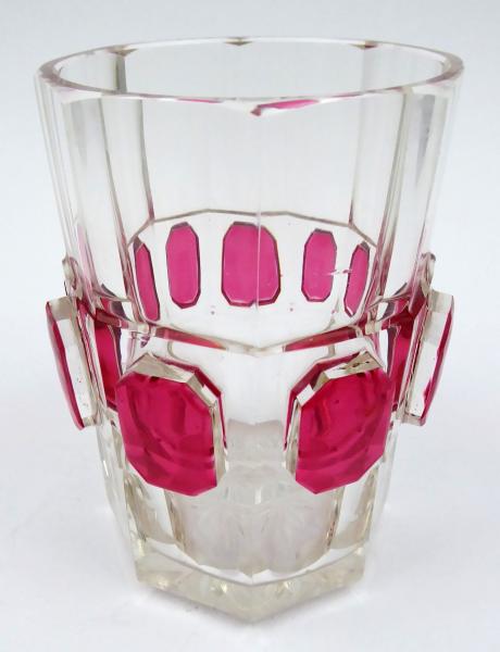 Čiré a rosalinové ručně broušené sklo. Sklenice z čirého skla zdobená ručně broušenými svislými fazetami a na středním vodorovném prstencovém pásu reliéfními vystupujícími medailony s růžovou lazurou. Čechy 1860 - 1880. Výška 11 cm.