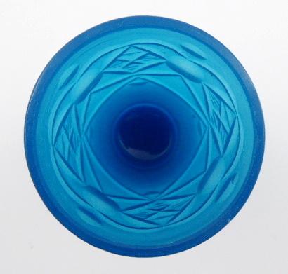 Světle modré opálové ručně broušené sklo. Období a styl: biedermeier. Biedermeierová číše ze světle modrého opálového skla zdobená ručně broušenými reliéfními medailony se stylizovanými čtyřlístky a čočkami různých velikostí. Čechy 1840 - 1870. Výška 11,5 cm.