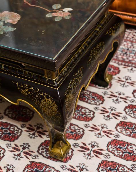 Výjimečný starožitný nízký stolek pocházející z Číny, zhotovený z masivního exotického dřeva a opatřený hlubokým černým lakem se zlacenými ornamenty. Horní deska je bohatě ručně malovaná a vykládaná ručně řezanými kameny, pravděpodobně jadeitem a dalšími polodrahokamy, s jemným květinovým motivem v tradiční čínské symbolice.