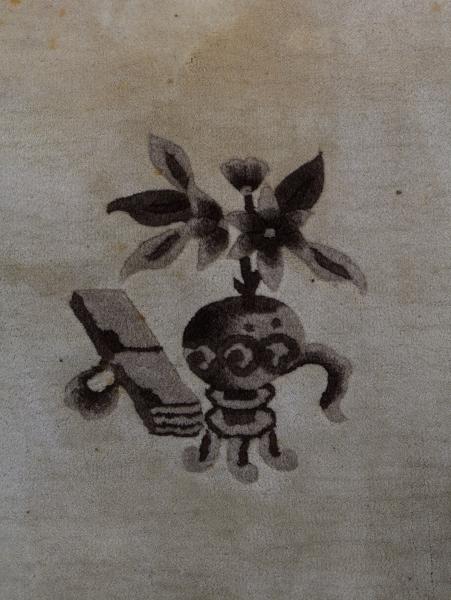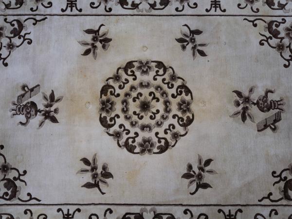 Středová kompozice s bohatě rozvinutým medailonem je doplněna stylizovanými florálními motivy a symboly štěstí, dlouhověkosti a prosperity, typickými pro čínskou dekorativní tradici. Ornamentální bordura vytváří vyvážený rám celku a podtrhuje reprezentativní charakter koberce.