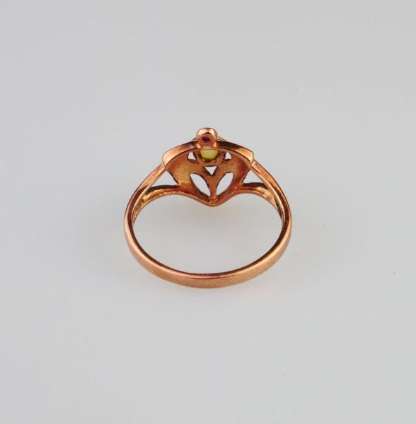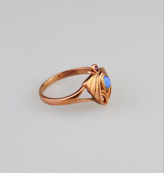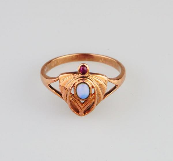zlatý secesní prstýnek s opálem a rubínkem, Au btto 2,14 g/333/1000, Německo, kolem r. 1910, atest Puncovního úřadu; velikost prstenu 55