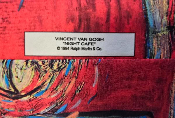 Popis: Výjimečná kravata značky Ralph Marlin s unikátním motivem ze slavného obrazu Noční kavárna na Place Lamartine od Vincenta van Gogha. Na zadní straně původní všitá visačka a vetkaný název obrazu. Perfektní stav, jako nová. Rarita.