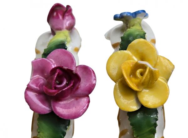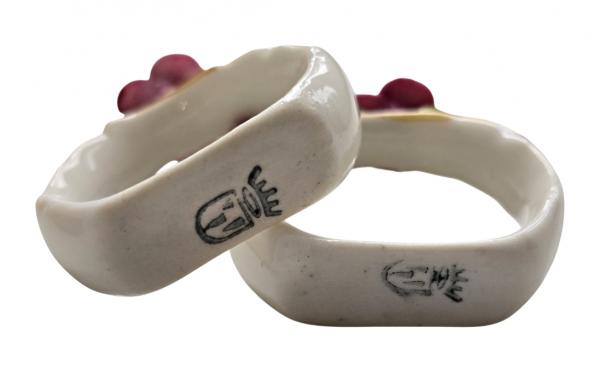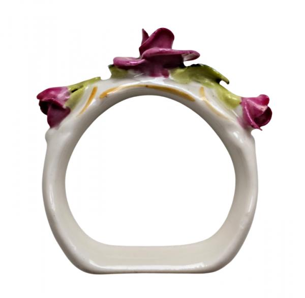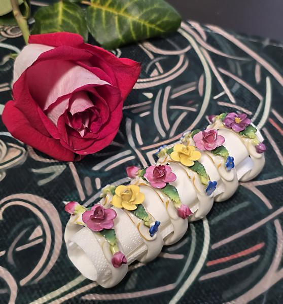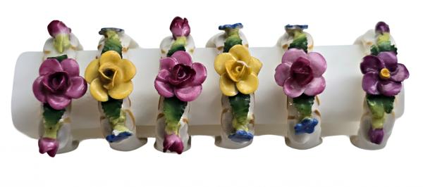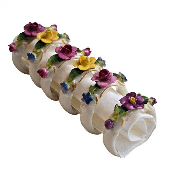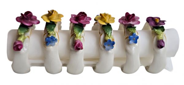 Popis: Porcelánové kroužky na ubrousky, zdobené různě barevnými kvítky. Ruční práce. Vzhledem ke stáří je stav dobrý, pouze na dvou kytičkách drobné otluky - viz foto. Na spodní straně značka.