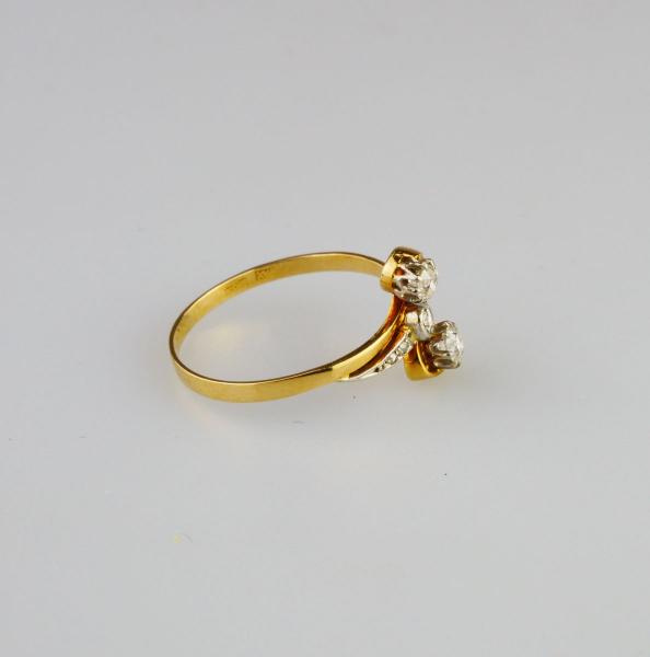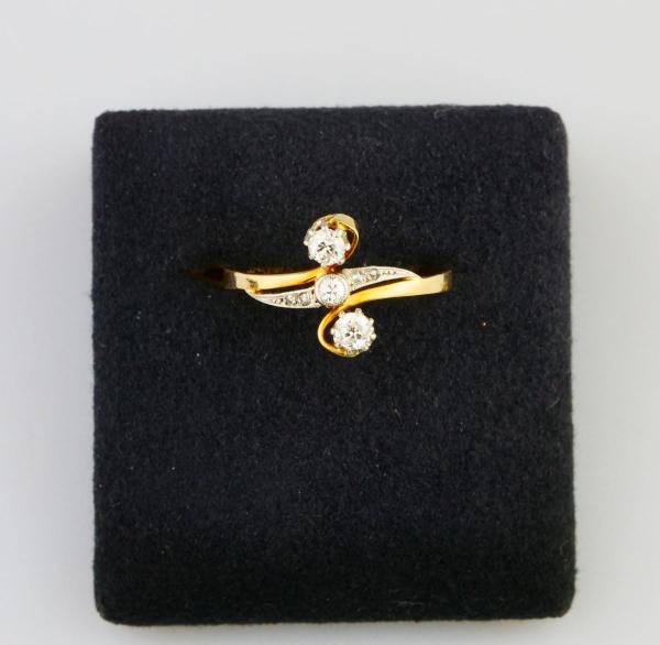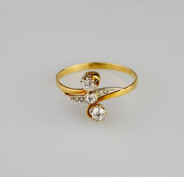 pozdně secesní drobnější zlatý prstýnek se 3 diamanty briliantového brusu o celkové hmotnosti cca 0,13 ct a se 4 diamantovými routami, kameny vsazené v platině, Au + Pt btto 1,81 g/585+900/1000, západní Evropa, kolem r. 1920; atest Puncovního úřadu; velikost prstenu 59
