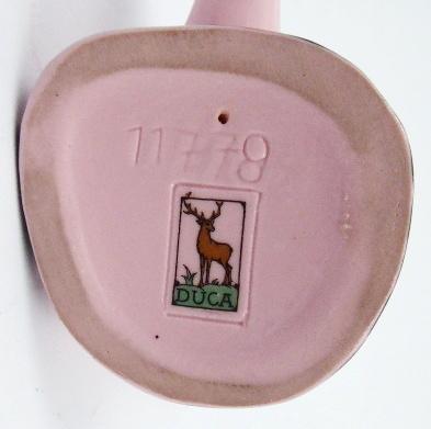 Růžová keramika, ručně barevně malovaná a zlacená. Období a styl: art deco. Firma Ditmar & Urbach vznikla v Trnovanech spojením znojemské továrny Dr. Rudolfa Ditmara a teplické společnosti bratří Urbachů v roce 1920. Ručně barevně malovaná a zlacená art deco figura kachničky z růžové keramiky. Kachna natahující krk je umístěna na nepravidelném nízkém podstavci ve spodní části zdobeném černým stylizovaným krajkovím. Ručně zlacený zobák, letky i ocas a blány na nohách. Na zadní části ocasního peří stékaná glazura. Značeno zespodu: firemní značka, v tomto případě figura jelena s nápisem DUCA, která se vyskytuje pouze ojediněle na výrobcích Ditmar & Urbach a vtlačená čísla. Československo, Trnovany u Teplic 1924 - 1925. Výška 6 cm, šířka 10 cm a hloubka 5 cm.
