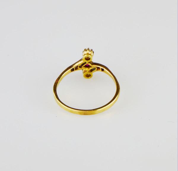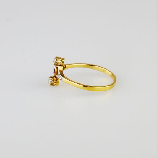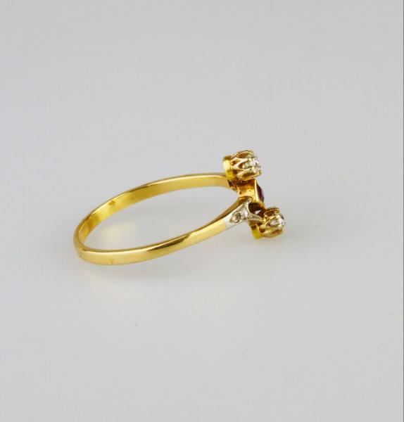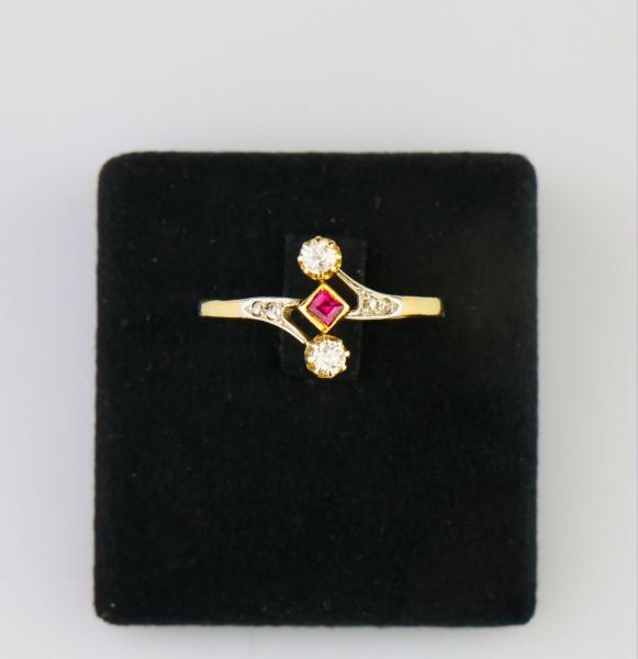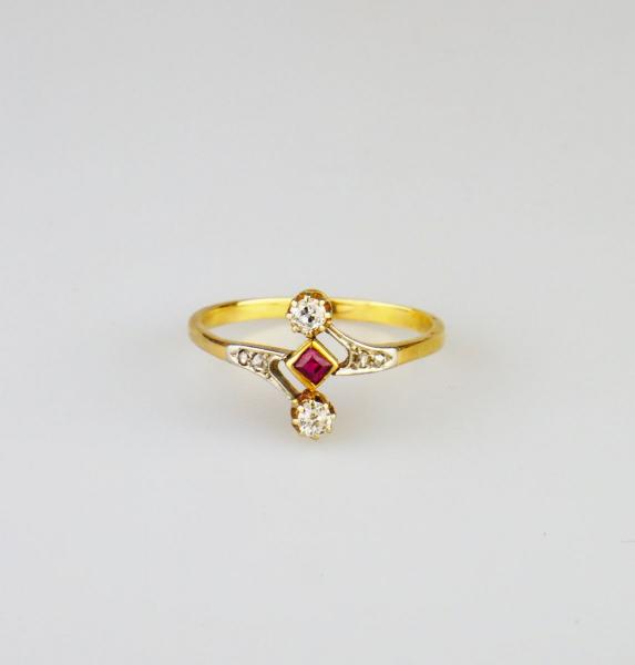 zlatý secesní prstýnek se čtvercovým rubínkem a 2 diamanty briliantového brusu o celkové hmotnosti cca 0,15 ct, na boku 4 diamantové routy, Au btto 2,54 g/550/1000, západní Evropa, kolem r. 1915, atest Puncovního úřadu; velikost prstenu 63
