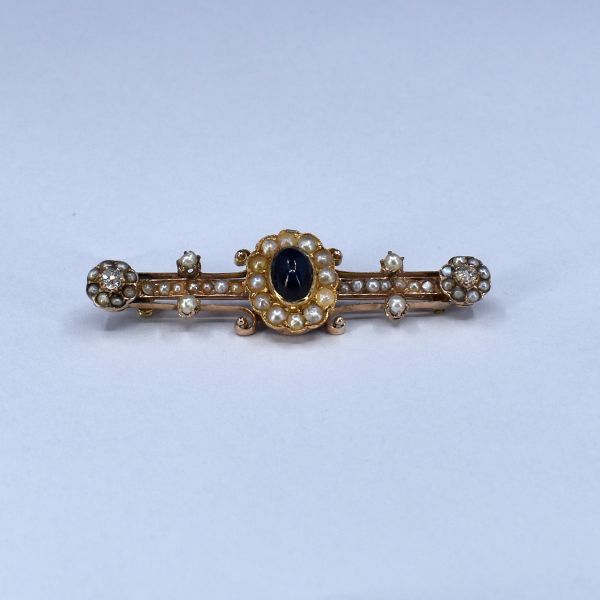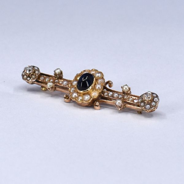 350-480/1000, v. 4,50 g, přírodní safír broušený do mugle, říční perličky, konec 19. století, APÚ, délka 49 mm