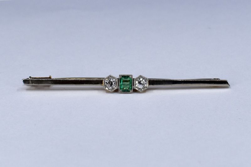 585/1000, v. 4,10 g, brilianty starého brusu 2 x 0,10 ct, smaragd tabulkového brusu, 1. třetina 20. století, čs. punc, délka 60 mm