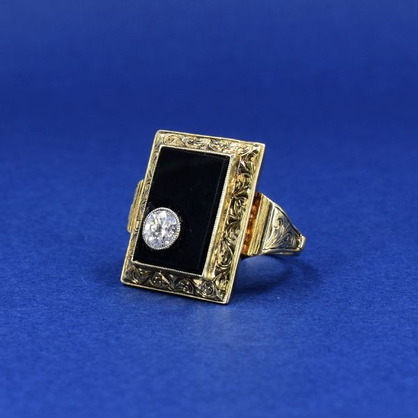 Starožitnost: Zlatý pánský prsten s onyxem a briliantem