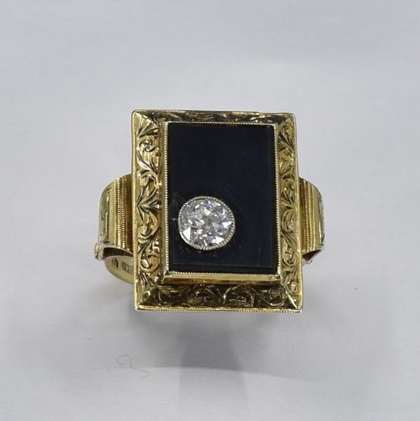 585/1000, v. 7,70 g, onyxová destička, briliant starého brusu cca 0,50 ct (I-K/P), 40. léta 20. století, gravírováno, velikost 60, čs. punc 1929 - 1949