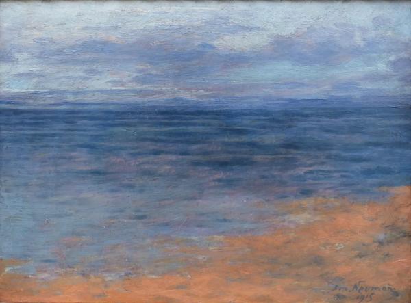 Olej na kartonu 21 cm x 29 cm. Signováno vpravo dole s datací 1915. Autor: Emanuel Neumann (1873-1932). Z malířových studijních cest do přímořských krajin. Impresionistická nálada na břehu klidného moře. V jednoduchém jemně reliéfně zdobeném zlatavém rámu. Jižní Evropa, rok 1915. Celkový rozměr s rámem 23,5 cm x 30,5 cm.