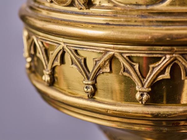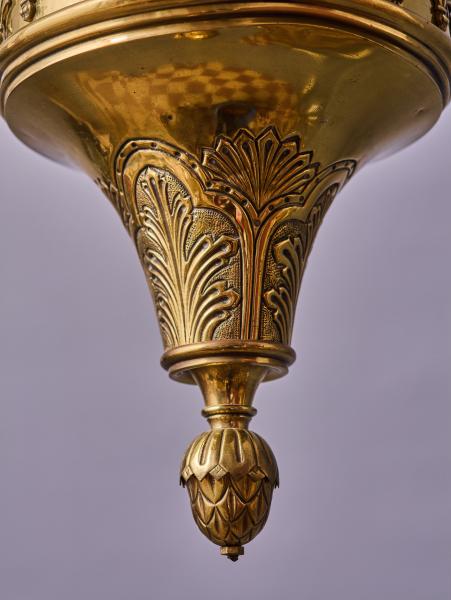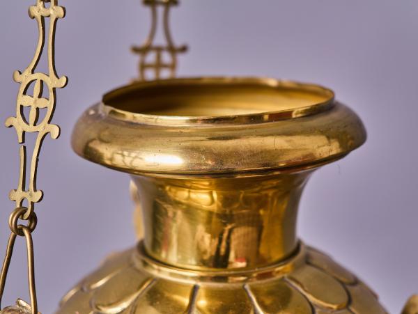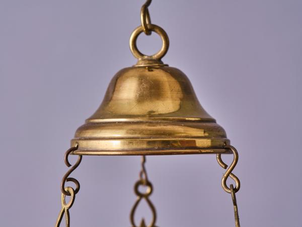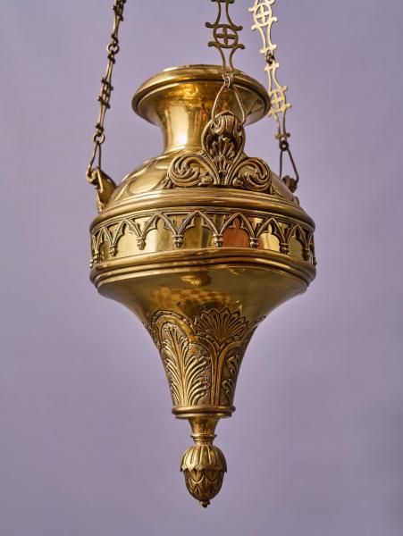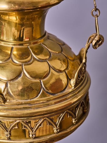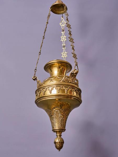 Reprezentativní závěsná lampa z mosazi, určená původně pro skleněnou olejovou nádobu. Jedná se o kvalitní sakrální svítidlo z období historismu, datované do konce 19. století.