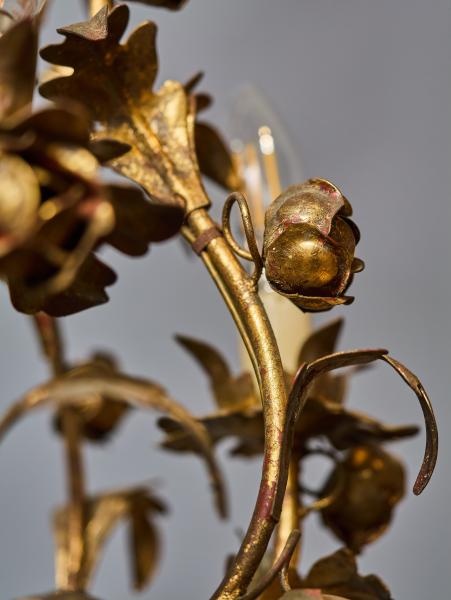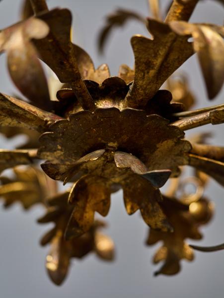 Menší čtyřramenný lustr z polychromovaného plechu umělecky ztvárněný jako svazek listů s květy. Lustr je celý ručně malovaný. Lustr je ideální do chodby nebo do zimní zahrady. Zkontrolovaná elektroinstalace - ihned k užívání. Žárovky s klasickým svíčkovým závitem E14 do 60W (vhodné jsou klasické, halogenové i led žárovky).
