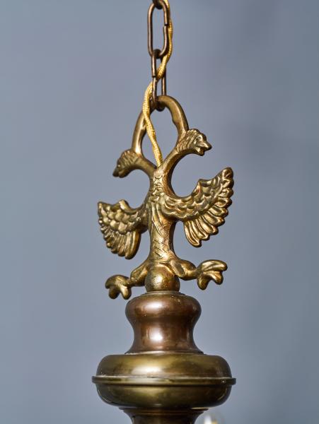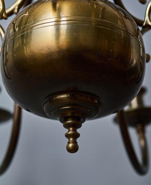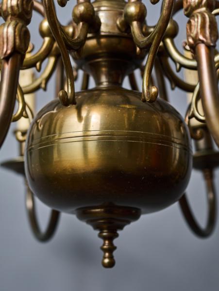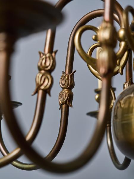 Krásný vlámský lustr z patinované mosazi. Ramena jsou florálně zdobená. Vrchní část s vlámskou orlicí. Zrestaurovaná elektroinstalace - ihned k užívání. Žárovky s klasickým svíčkovým závitem E14 do 60W (vhodné jsou klasické i led žárovky).