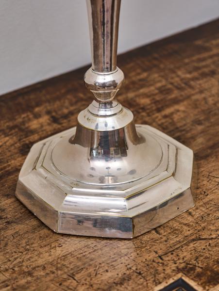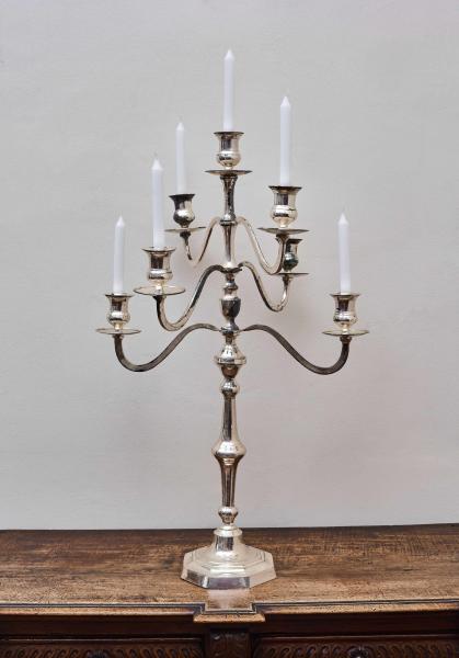 Velký sedmiramenný svícen z kovu se stříbřeným povrchem, zhotovený v klasickém historizujícím stylu. Svícen stojí na široké osmihranné základně a má vysoký, elegantně profilovaný dřík, z něhož vyrůstají symetricky tvarovaná ramena nesoucí šest svíček, zatímco sedmá svíce je umístěna na vrcholu centrálního sloupku. Celek vytváří vyváženou a velmi dekorativní kompozici typickou pro slavnostní stolní či interiérové osvětlení.