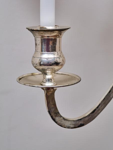 Ramena svícnu jsou jemně prohnutá a zakončená kalichovitými objímkami s miskami zachycujícími vosk. Lesklý stříbřený povrch zvýrazňuje plastické tvarování jednotlivých částí a dodává svícnu reprezentativní charakter. Patina a drobné známky užívání na povrchu odpovídají stáří předmětu a podtrhují jeho autentický vzhled.