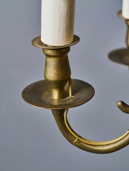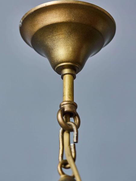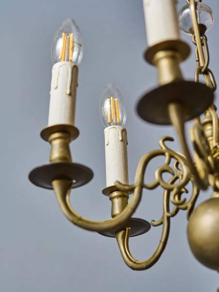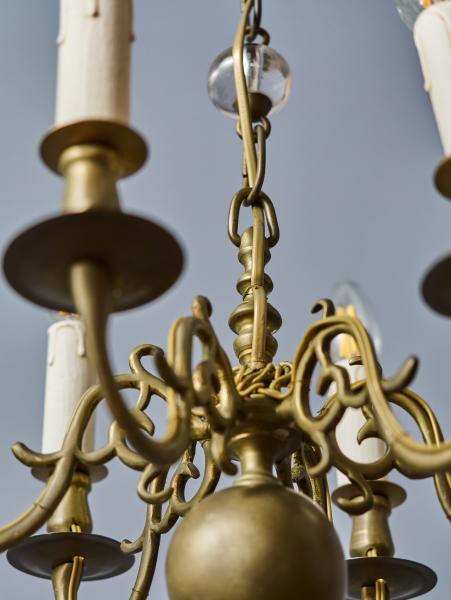 Výrazným a velmi dekorativním prvkem je původní závěsný řetěz doplněný skleněnými koulemi, které přinášejí jemný světelný akcent a dodávají lustru osobitou noblesu. Bílé objímky stylizované do podoby svíček s miskami pod svícny připomínají historické svíčkové lustry, jejichž forma byla v 19. století postupně přizpůsobena elektrickému osvětlení.