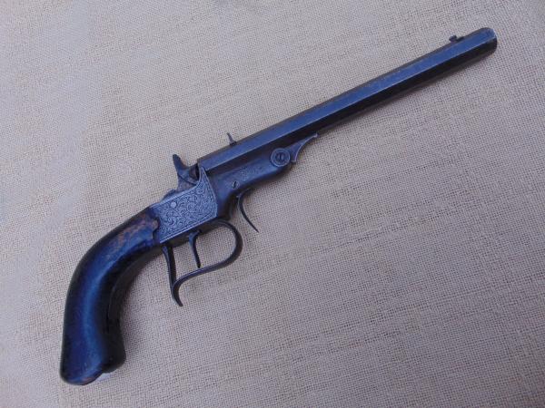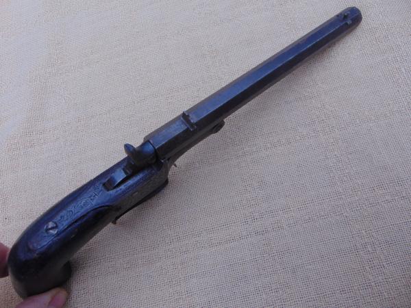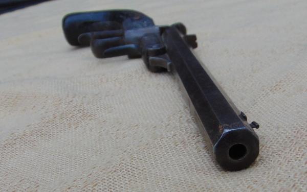 pistole krátká délka 20 cm, mechanika funkční - dobrá, průměr hlavně 13 cm -...