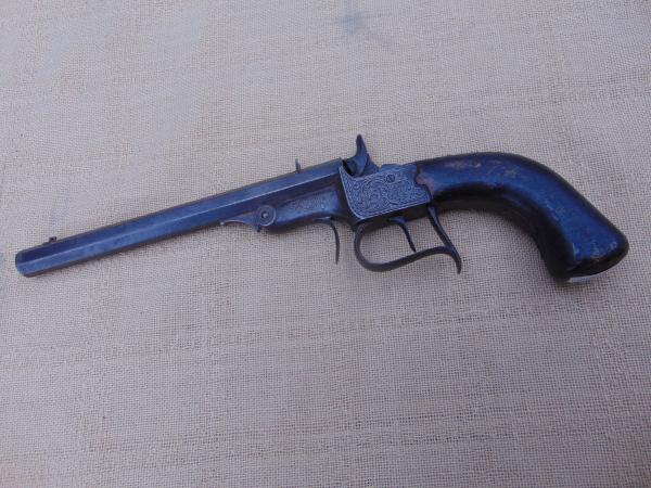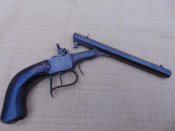 Flobert délka 30 cm, průměr hlavně 6 mm, mechanika funkční, sklopná hlaveň