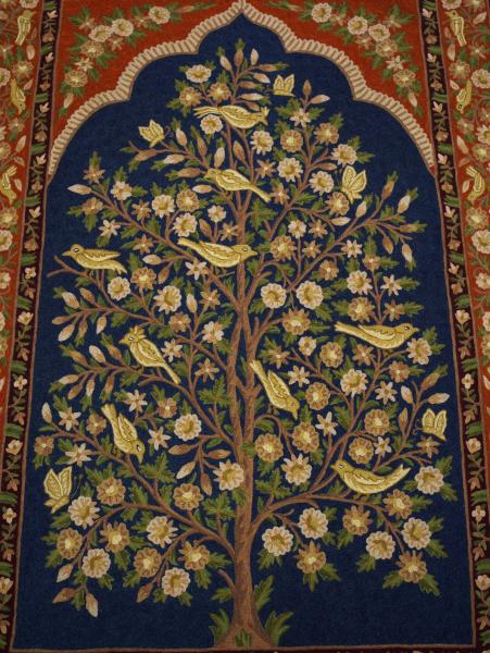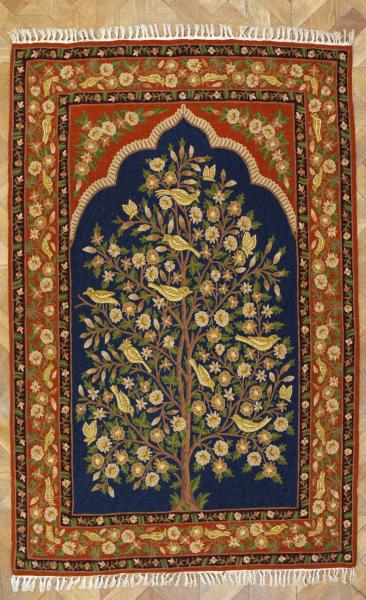 Výjimečný ručně tkaný koberec v podobě nástěnné tapiserie s motivem Stromu života, bohatě zdobený květinami a stylizovanými ptáky v orientálním duchu. Kompozice vychází z tradiční symboliky hojnosti, harmonie a života, která je typická pro perské a indické umění.