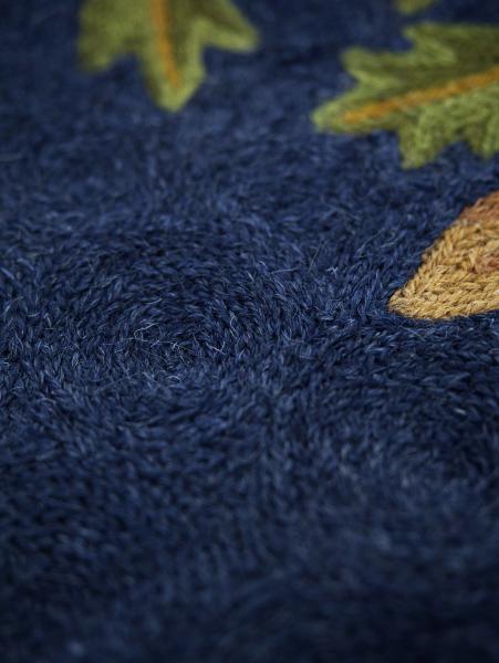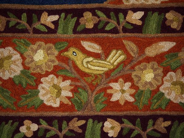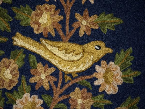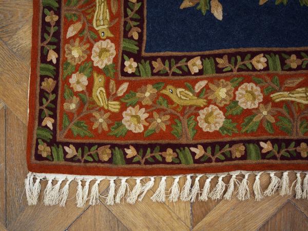Koberec je zhotoven na bavlněné osnově. Vyniká precizním řemeslným zpracováním, jemným detailem jednotlivých květů i ptáků a harmonickou barevností – hluboká modř centrální plochy kontrastuje s teplými tóny červené, okrové, zelené a krémové v bohaté borduře.