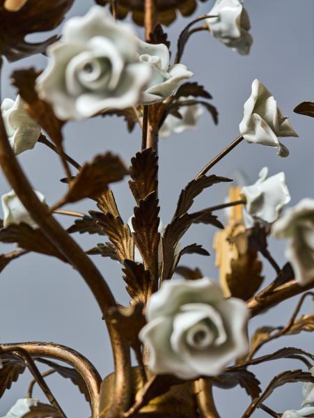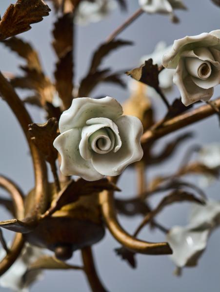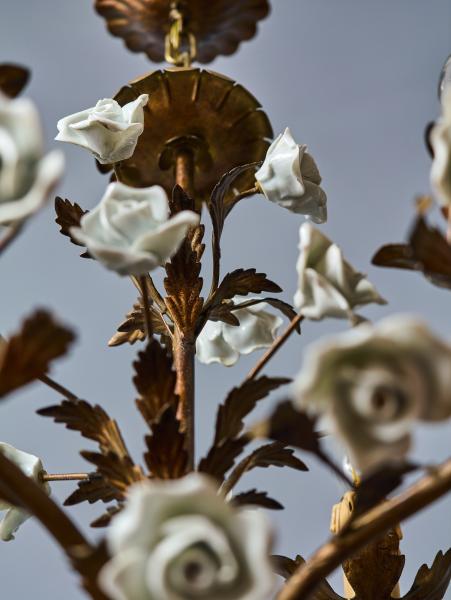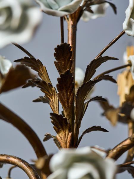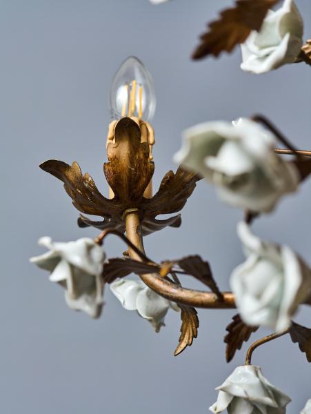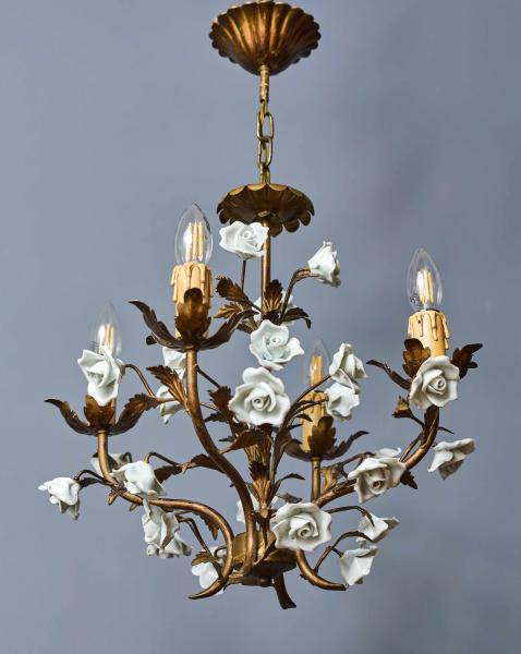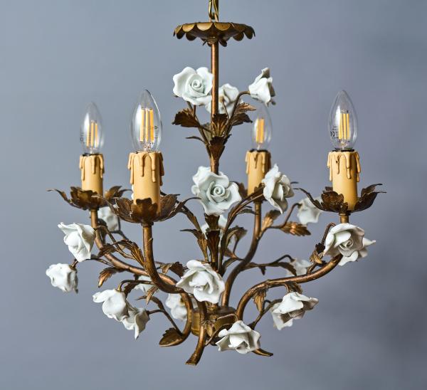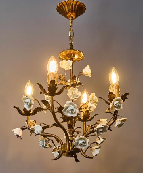 Menší kovový lustr ve zlaté barvě umělecky ztvárněný jako svazek listů s porcelánovými květy. Lustr je celý ručně malovaný. Lustr je ideální do chodby nebo do zimní zahrady. Zkontrolovaná elektroinstalace - ihned k užívání. Žárovky s klasickým svíčkovým závitem E14 do 60W (vhodné jsou klasické, halogenové i led žárovky).