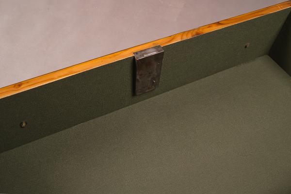 Zcela mimořádným prvkem této komody je plasticky modelovaný rám obíhající čela zásuvek. Tento rám je jemně konkávně prohnutý a celoplošně dýhovaný, přičemž dýha plynule kopíruje jeho tvar. Jedná se o technologicky náročné řešení, které výrazně přesahuje běžnou produkci své doby a svědčí o vysoké úrovni původní řemeslné práce. Tento detail vytváří subtilní hru světla a stínu a dodává komodě plastickou hloubku i vizuální noblesu.