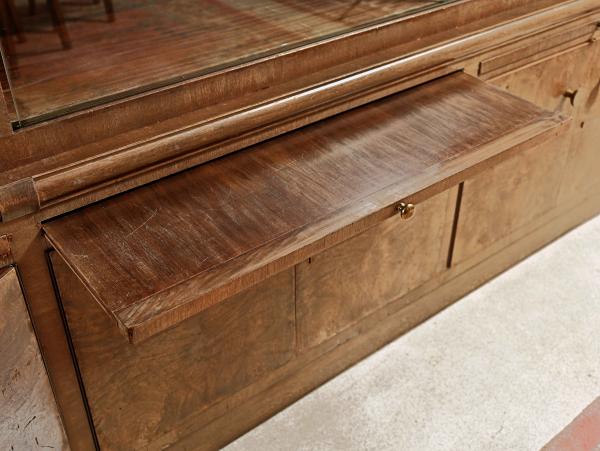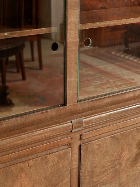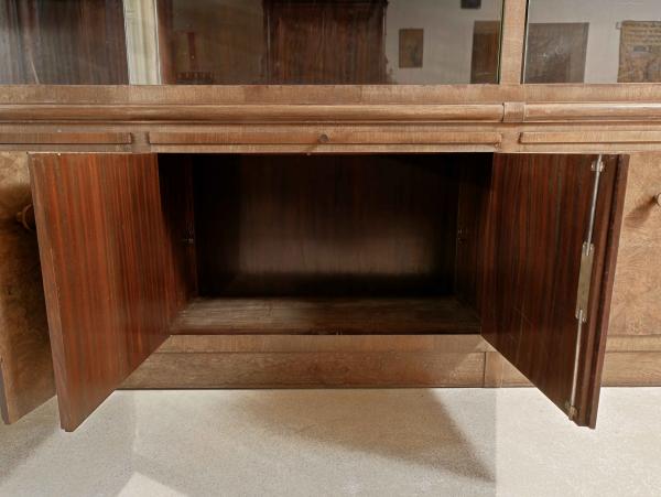 Velká knihovna ve stylu Art Deco, impozantní kus nábytku s délkou 385 cm, vhodný do reprezentativních interiérů, knihoven, kanceláří nebo zámeckých prostor. Knihovna pochází z období první poloviny 20. století a zaujme čistými liniemi typickými pro Art Deco a krásnou dýhou z kořenice, která je na spodních dvířkách zrcadlově skládaná.